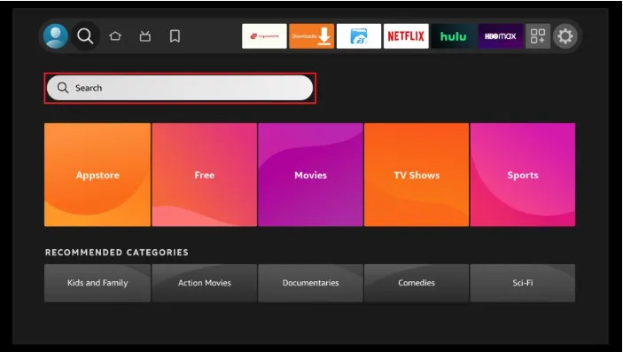 1. Vous devez être sur l'écran d'accueil de FireStick. Sélectionnez RECHERCHER.